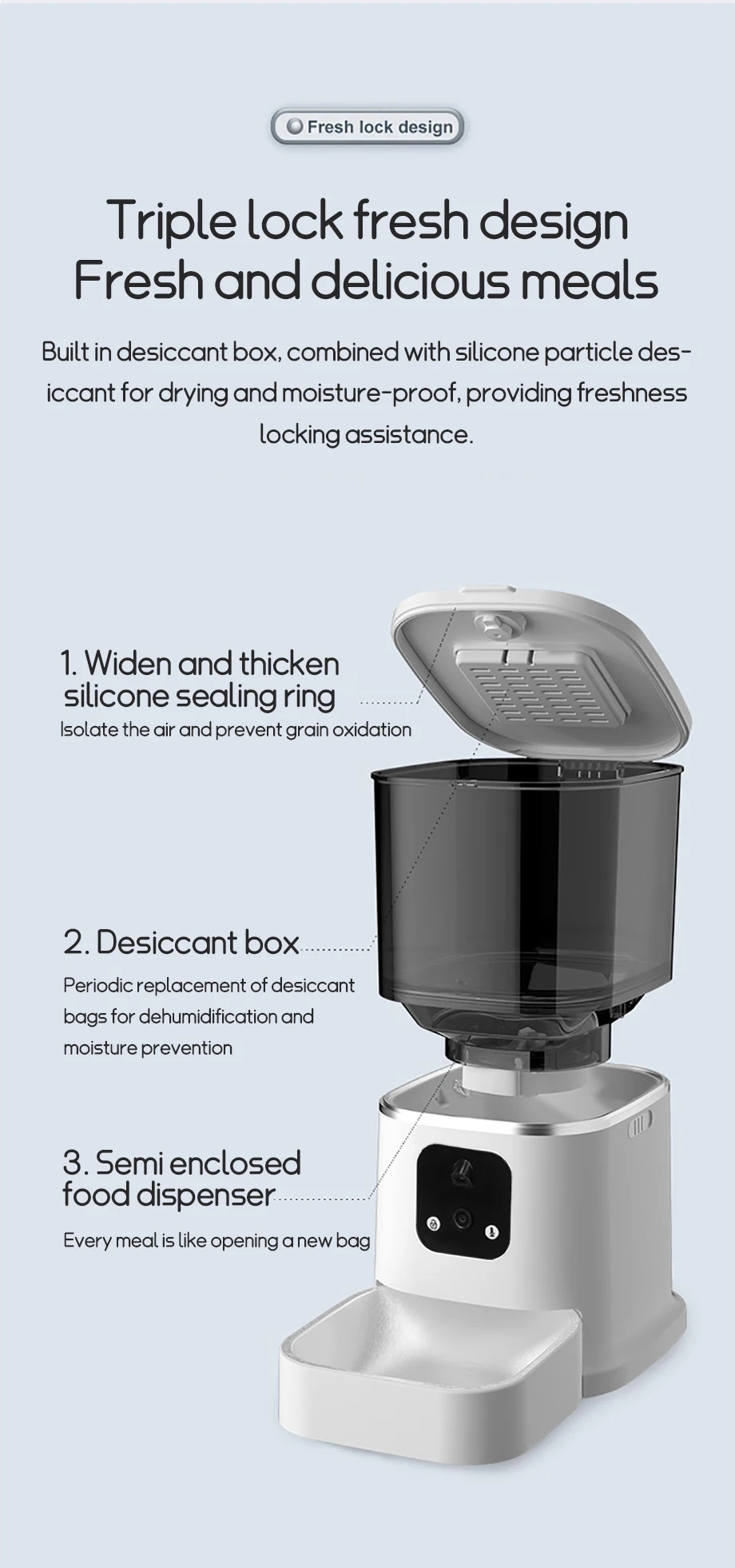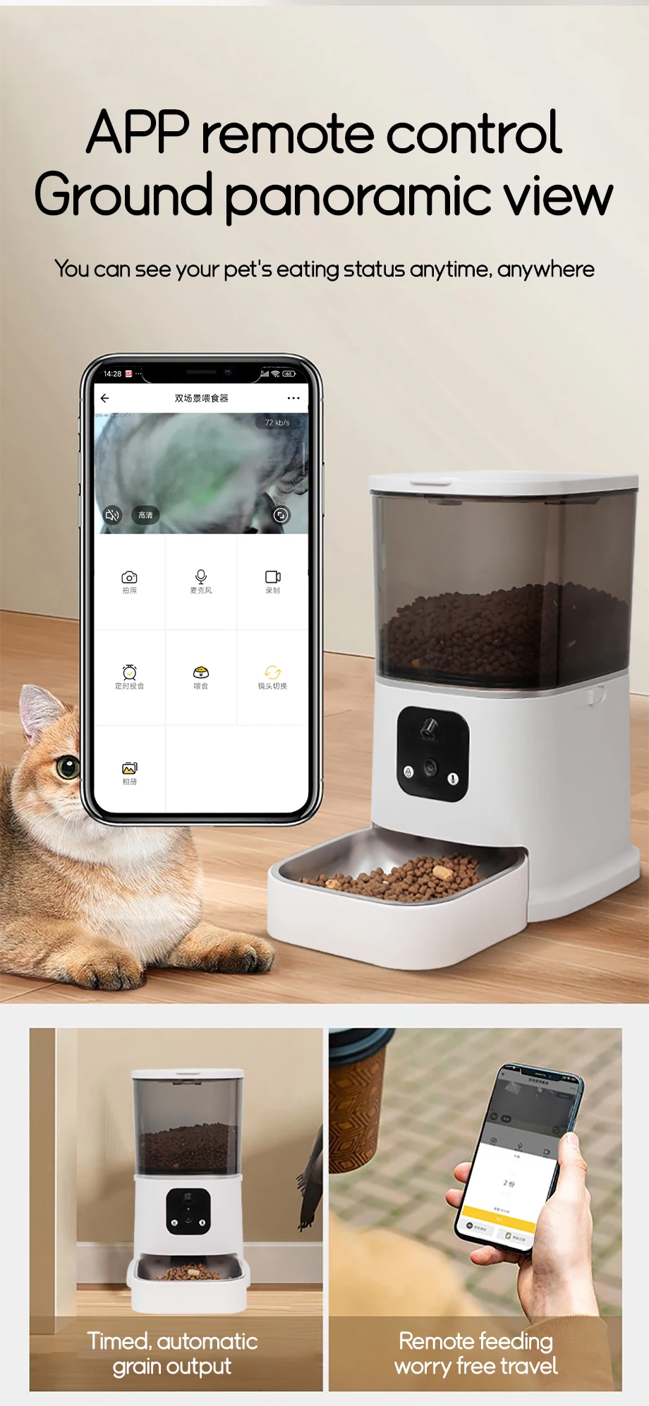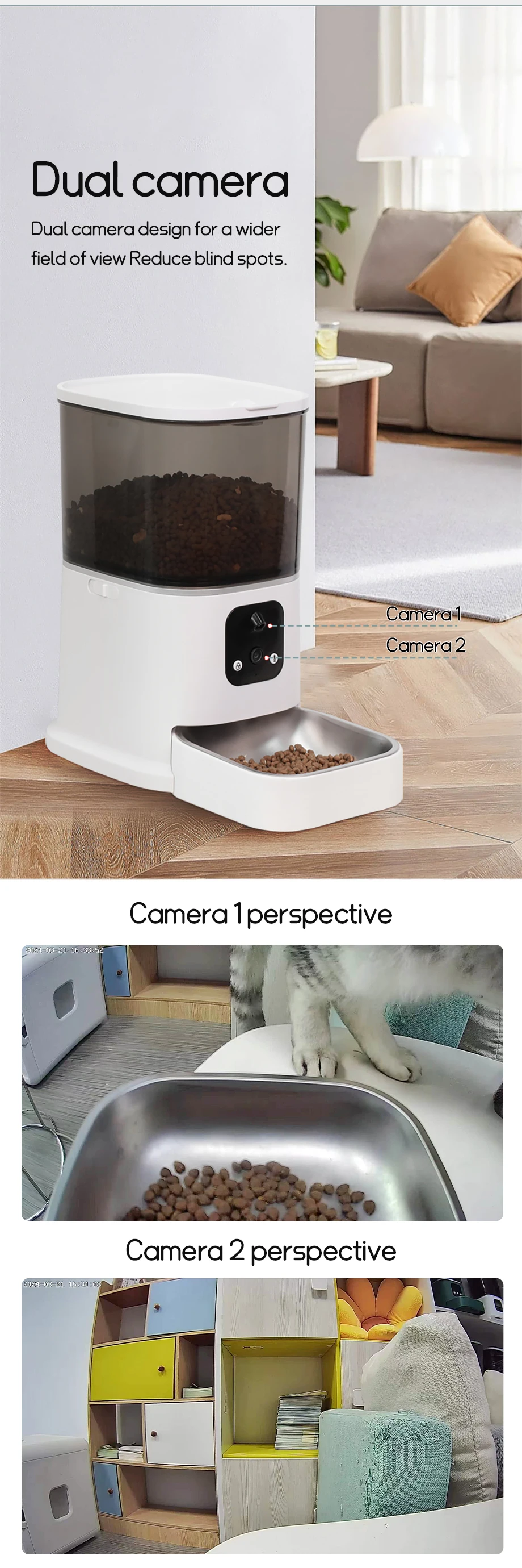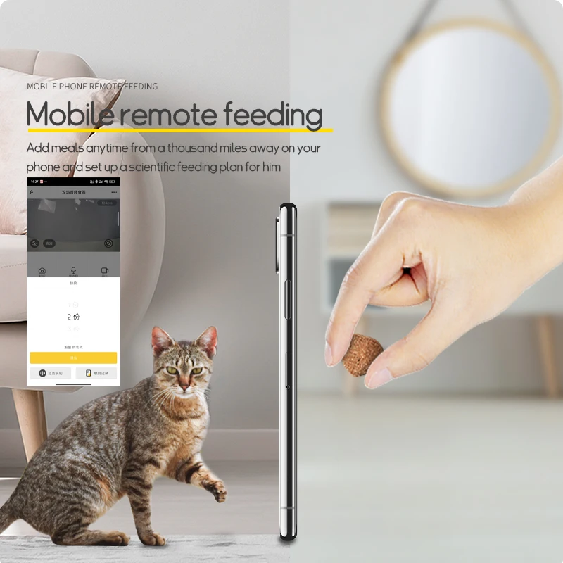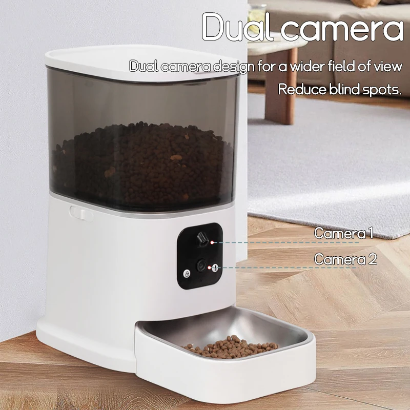 ■ WiFi Remote Control 📱 – Manage feeding via 2.4GHz WiFi through iOS/Android app (Smart Life compatible). dispense meals on-demand or set schedules, with real-time notifications when food runs low 🔔.